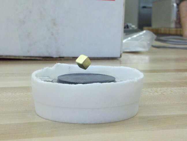 I just think this is cool. This is an image of a Meissner Effect demonstration for a lab that I did recently. The effect lets you easily levitate a magnet above a superconductor. That is, if you call attaining temperatures of 80 Kelvin easy (which technically it is – liquid nitrogen boils at 77 K – you just don’t see it every day).